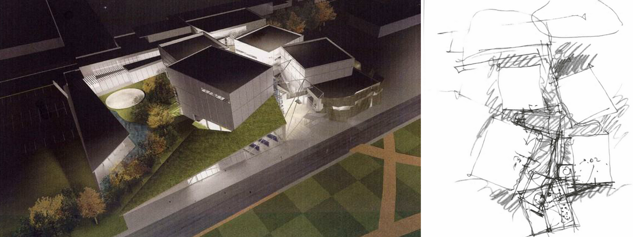 Pavillon parlementaire, rue Bank, Ottawa, 2003, finaliste d’un concours national. – Ce projet mesure la tradition néogothique du site et crée l’interface entre la colline Parlementaire et l’enceinte de la Cour suprême, de même qu’entre la ville d’Ottawa et la rivière des Outaouais. Au croisement de la nature et de la culture, il est dynamique et reflète les nouvelles émergences, tant politiques et sociales qu’environnementales et technologiques. Source : Extrait monographie Provencher Roy + Associés, 2009 – Architectes : Provencher_Roy, en consortium Zeidler Grinnel, Hotson Bakker Associates Architects