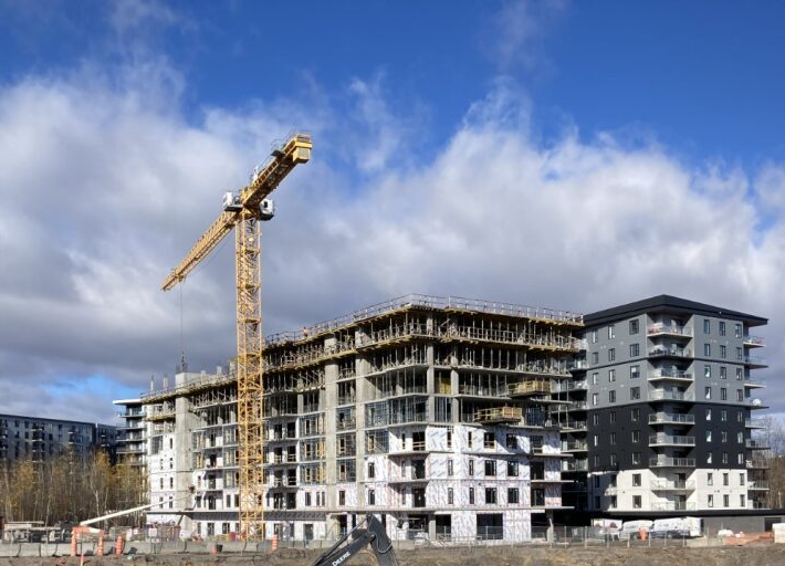 Projet Huma, Saint-Romuald, le système de mur D-Max avec mousse giclée Airmétic Soya HP est assemblé au fur et à mesure que l’ossature est érigée et l’isolation complétée à chaque étage – Source : Huntsman Solutions Bâtiments.