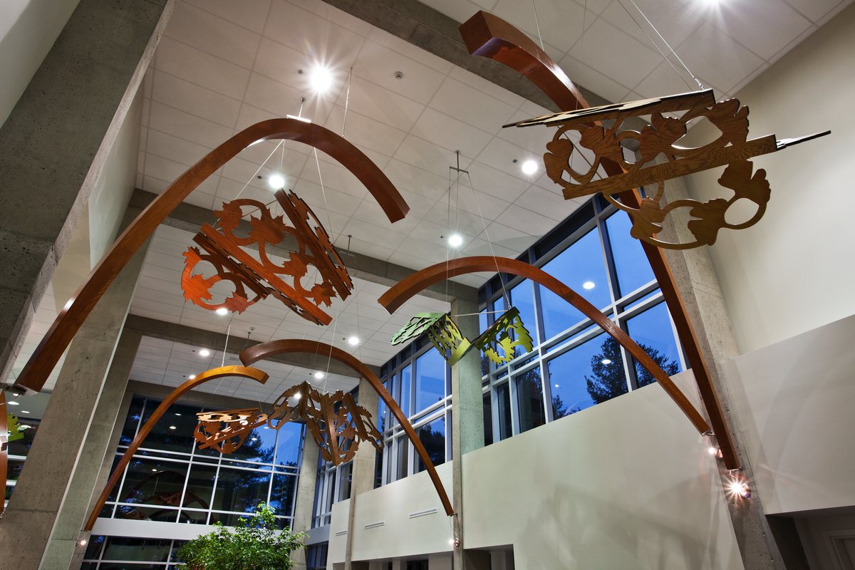 Installée au Centre d’hébergement Roland-Leclerc à Trois-Rivières, cette dernière se compose de sept arches de bois surplombant une place publique largement fenestrée et ouverte sur la nature environnante. Se greffent sur le sommet des arcades des feuillages ajourés construits en bois et représentant des arbres à différentes saisons. Actionné par des moteurs dissimulés dans l’entre-plafond, le mécanisme bouge lentement selon des cycles précis, imitant une brise légère prolongeant la nature à l’intérieur du bâtiment. C’est dans ce contexte que le spectateur est invité à forger son propre récit. L’œuvre inspire un sentiment de sécurité, de quiétude, tout en offrant aux résidents une possibilité d’évasion par l’art. La conception des œuvres intégrées de l’artiste s’élabore de façon réflexive, prenant en compte différents phénomènes autant physiologiques, psychiques que sociologiques.