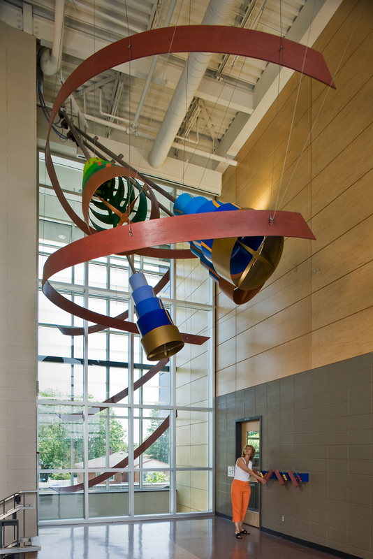 Impulsion. Sculpture suspendue interactive, cette production de 2008 prolonge par l’utilisation de manettes le mouvement initié par des élèves en perte de mobilité. Construite en aluminium peint, elle mesure 9 m x 9 m x 3,8 m. – Photo : Michel Dubreuil
