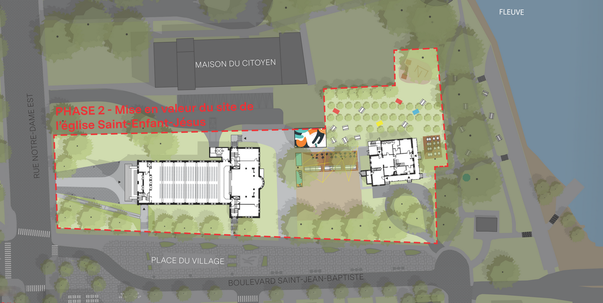 L’église Saint-Enfant-Jésus devient une grande salle multifonctionnelle. Le presbytère devient une auberge gourmande avec terrasse sur le fleuve. La grange devient une buvette de jardin saisonnière. La cour devient un espace événementiel. – Illustration : NÓS Architectes