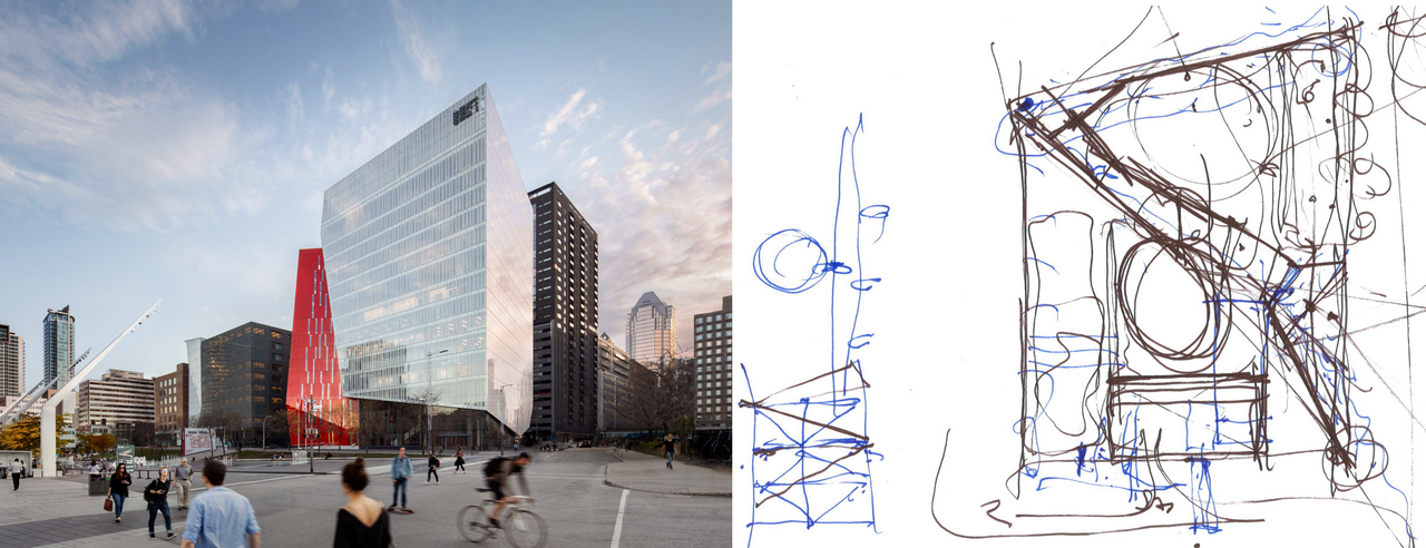 Ce geste créatif à main levée constitue le canevas, l’amorce d’une réalisation tangible qui ne se définit pas simplement sur le seul plan architectural, l’objet en soi. Plutôt, il s’insère dans une pensée globale en relation étroite et respectueuse avec son environnement physique, bien entendu, mais aussi, élément fondamental, avec ses occupants. Sophistiquée, son approche multidisciplinaire contribue à la réflexion de l’architecture urbaine, un espace qu’il voulait à l’échelle humaine.
