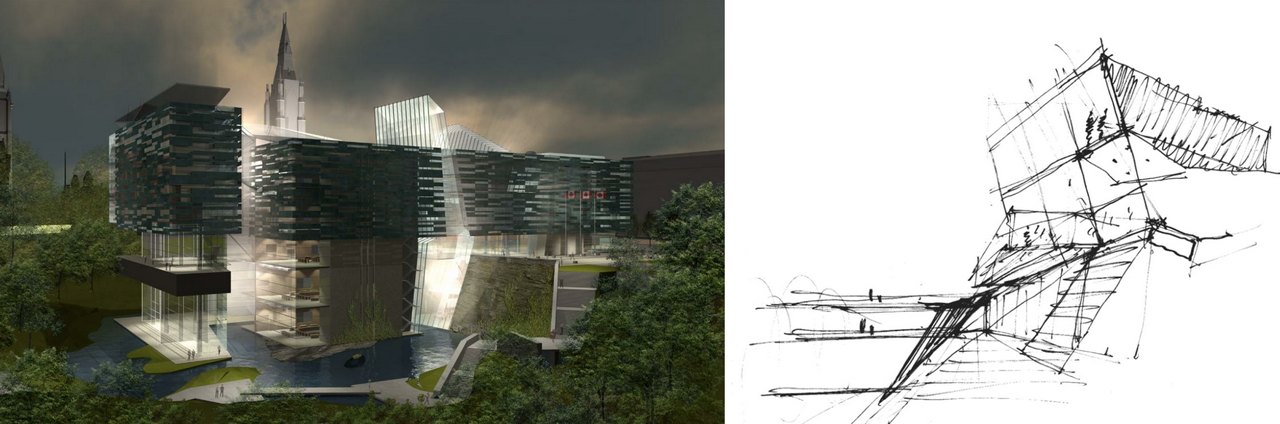 Pavillon parlementaire, rue Bank, Ottawa, 2003, finaliste d’un concours national. – Ce projet mesure la tradition néogothique du site et crée l’interface entre la colline Parlementaire et l’enceinte de la Cour suprême, de même qu’entre la ville d’Ottawa et la rivière des Outaouais. Au croisement de la nature et de la culture, il est dynamique et reflète les nouvelles émergences, tant politiques et sociales qu’environnementales et technologiques. Source : Extrait monographie Provencher Roy + Associés, 2009 – Architectes : Provencher_Roy, en consortium Zeidler Grinnel, Hotson Bakker Associates Architects