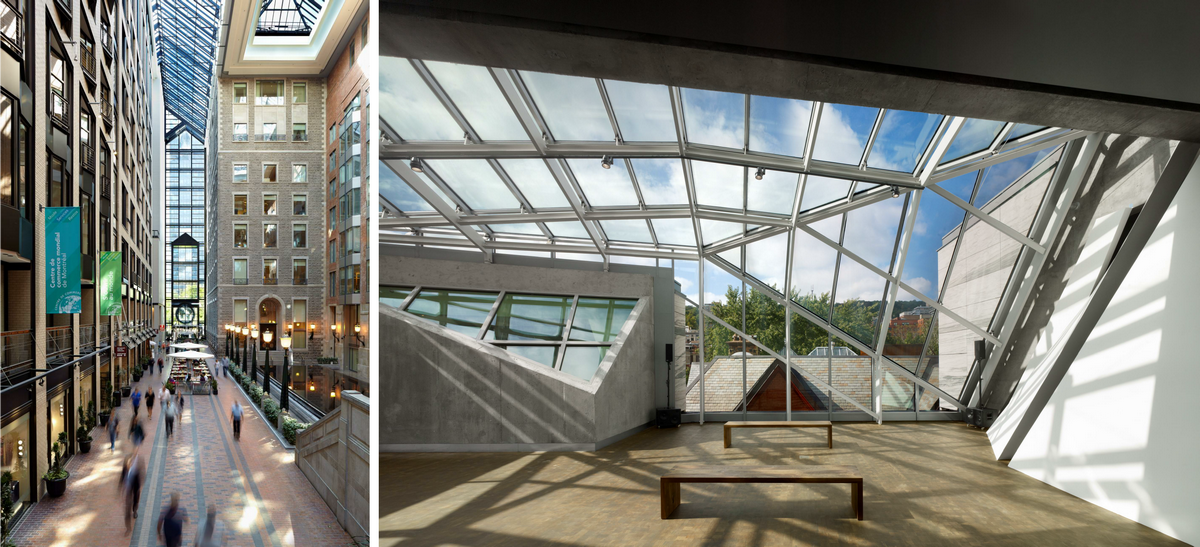 Centre de commerce mondial, Montréal, 1992. – L’importante idée de mettre en valeur un îlot urbain situé dans le quartier historique et le secteur d’échanges internationaux de Montréal a donné lieu à un projet de grande envergure de rénovation, de restauration et de construction à usage mixte. Source : Provencher_Roy – Architectes : Provencher_Roy, en consortium Groupe Arcop – Photo : Stéphane Poulin