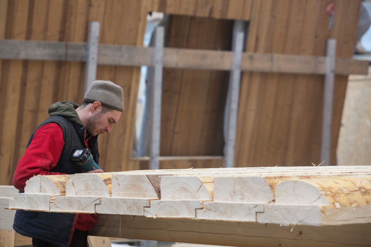Découpe des grumes d’épicéa et préfabrication des modules du bâtiment UP STRAW dans l’usine du constructeur Mobic. – Photo: Denis Vasilov.