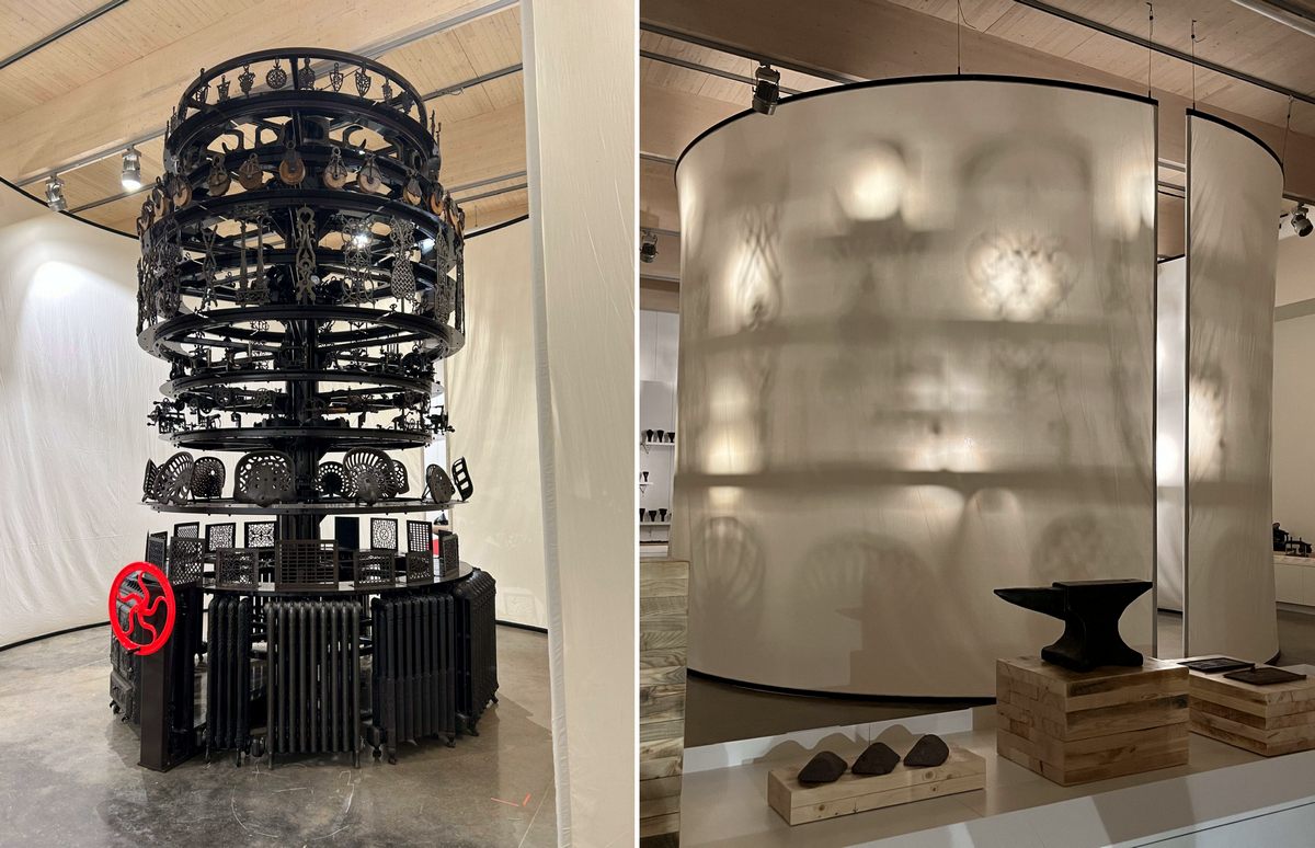 La scénographie est signée GSM Projects, et l'entreprise Jack World, spécialiste dans la fabrication et la conception d’installations interactives destinées aux espaces publics, a créé du mobilier sur mesure et un carrousel interactif géant qu’on peut faire tourner. Une façon ludique de mettre en valeur une sélection d’objets en fonte.