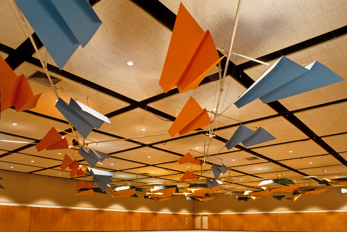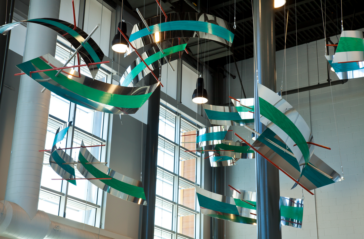 Impulsion. Sculpture suspendue interactive, cette production de 2008 prolonge par l’utilisation de manettes le mouvement initié par des élèves en perte de mobilité. Construite en aluminium peint, elle mesure 9 m x 9 m x 3,8 m. – Photo : Michel Dubreuil