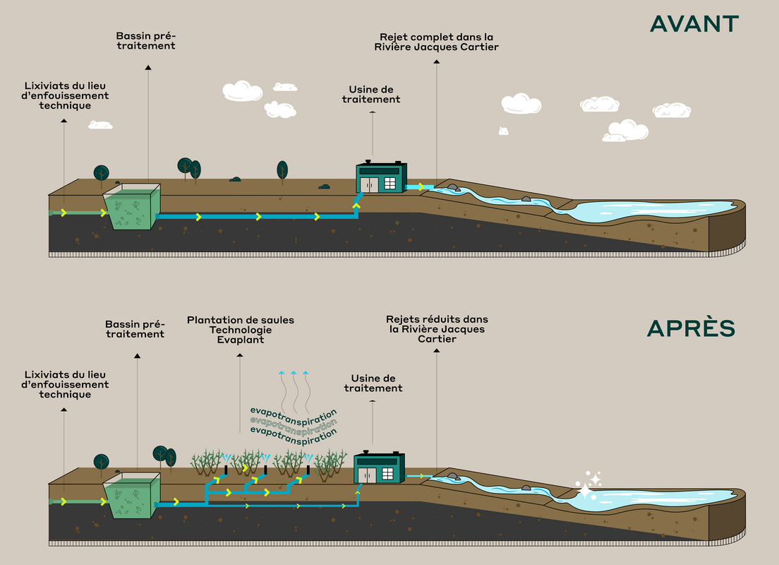 Sommaire du système Evaplant – Une plantation de 96 000 saules est irriguée par les eaux sorties du bassin de prétraitement. En parcourant la plantation, la majeure partie des eaux et des contaminants sont absorbés par les saules. Ces derniers, par évapotranspiration, permettent de réduire de 1 million de litres par an le volume d’eaux usées qui doit ensuite passer par l’usine de traitement. – Source : Complexe environnemental de Neuville. – Photo : RRGMRP