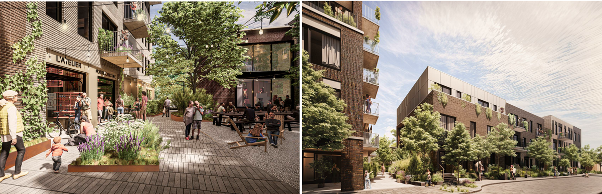 Entrée sud de la ruelle verte, rue Sainte-Anne, et vue sur le bâtiment de trois étages reprenant la typologie du quartier environnant offrant une transition douce de hauteur (bâtiments B et C). La ruelle sera aménagée avec des espaces extérieurs de détente prévus pour les locataires et un aménagement paysager assurant une intimité aux entrées. – Source : ADHOC
