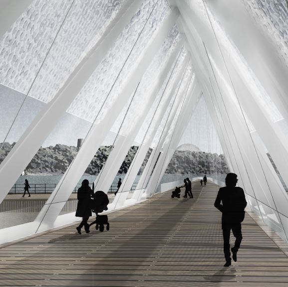 Projet localisé le long de la voie maritime entre le pont Victoria et l’écluse de Sainte-Catherine qui propose un ruban de 13 km d’aménagements axés sur la santé, le plein air et la contemplation. En 2067, la population de la région est devenue si importante, et les besoins pour de nouveaux espaces si criants que le site s’est réinventé. Les Montréalais peuvent désormais se détendre sur les rives du fleuve, où le plan d’eau est à son plus large. Ils accèdent au site rapidement et sans voiture et la digue est aménagée à la manière des promenades en bord de mer. L’équipe s’est inspirée de la construction du Montréal souterrain vers 1960. À l’époque, les promoteurs immobiliers qui obtenaient des lots près des stations de métro s’engageaient à aménager des aires publiques. Même principe pour la digue.